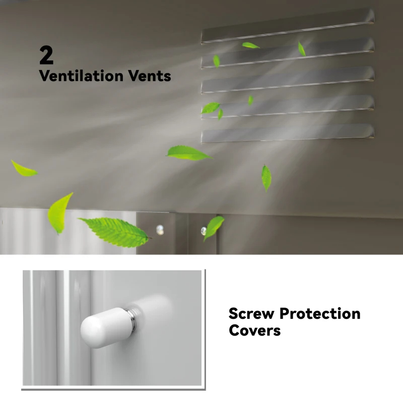 - - Great Ventilation: Keep tools outside without worry. Two vents on our metal shed keep the interior cool and dry, preventing odors.
